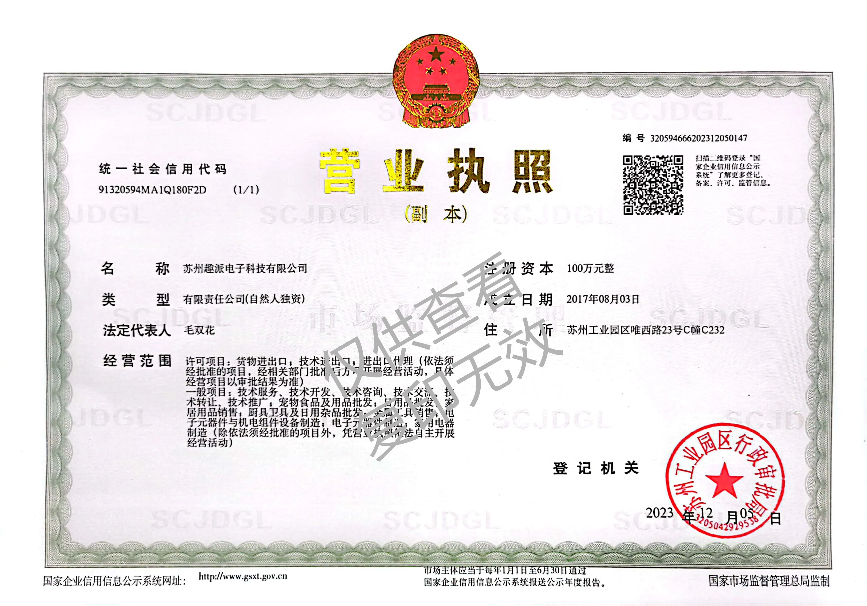 Registered address : Room 201, 2nd Floor, No.2 Chunhui Road, Suzhou Industrial Park Suzhou Jiangsu China